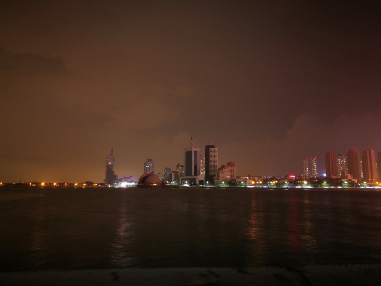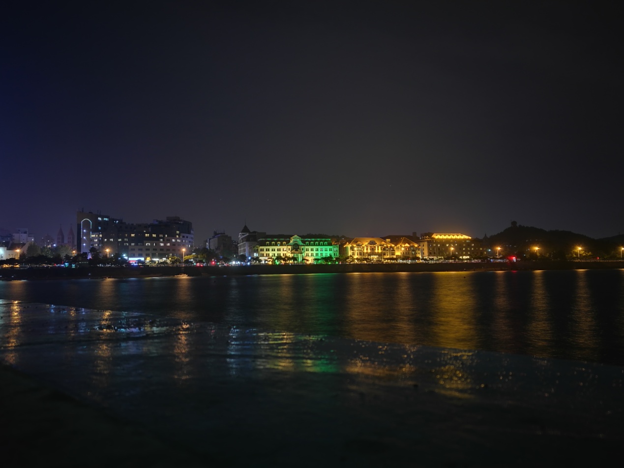 華燈初上,城市燈火輝煌,夜晚的棧橋穿上了華麗的禮服,和棧橋左面的中國功勛的中山艦艇遙相輝映,氣勢磅礴,比起上海的外灘來毫不遜色。