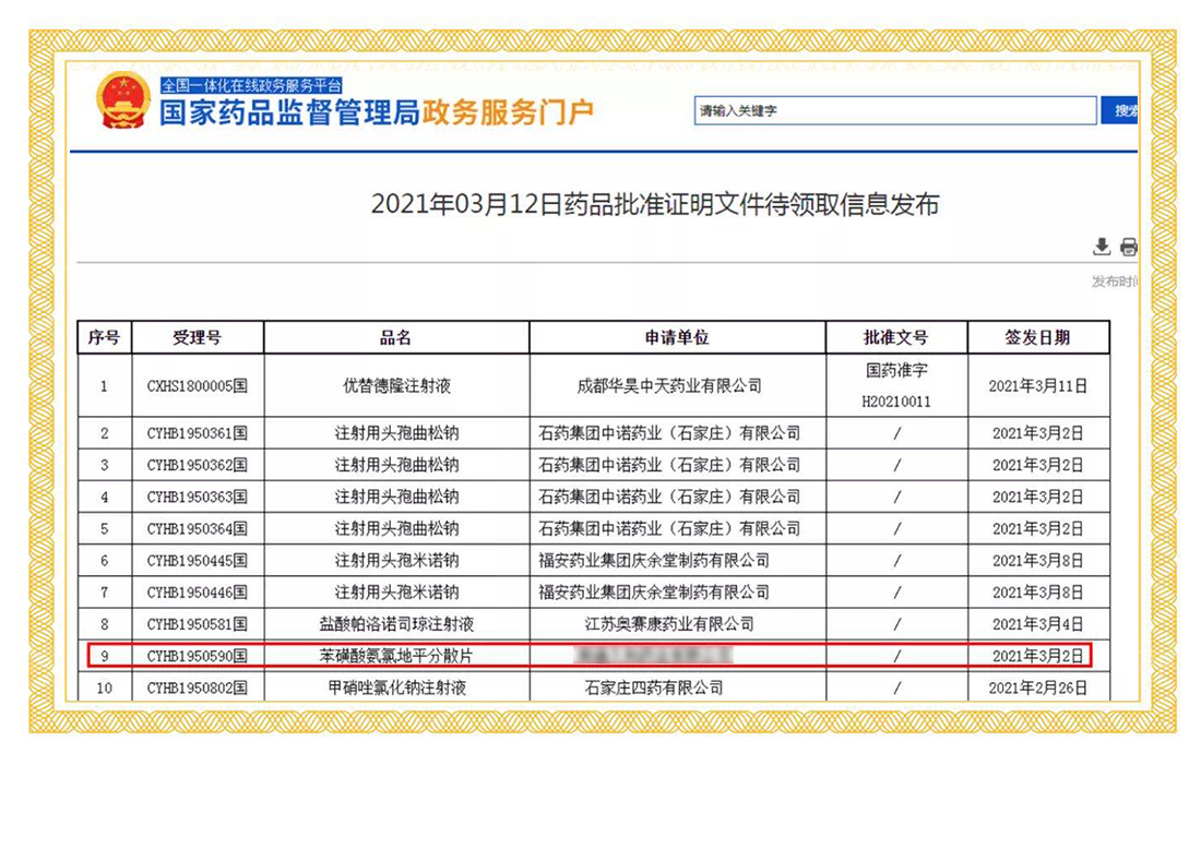 2021年3月2日,國家藥品監(jiān)督管理局正式發(fā)布通知,華威醫(yī)藥接受委托申報(bào)的苯磺酸氨氯地平分散片正式通過仿制藥質(zhì)量和療效一致性評價(jià),成為首家過評企業(yè)!