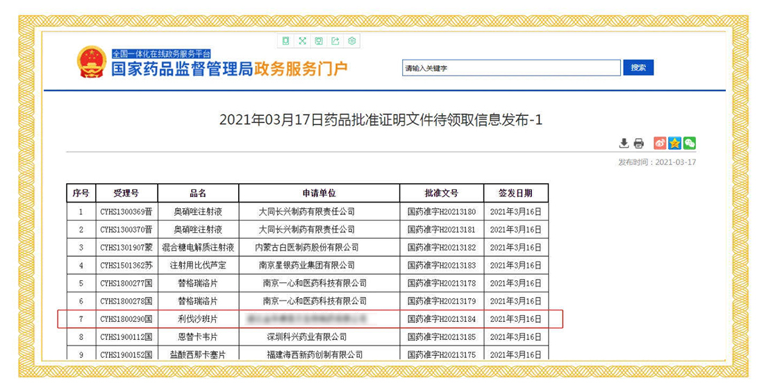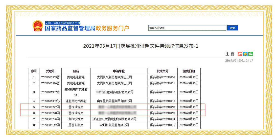 2021年3月16日,國家藥品監(jiān)督管理局正式發(fā)布通知,華威醫(yī)藥接受委托申報(bào)的的替格瑞諾片(90mg、60mg)項(xiàng)目正式通過審評審批,獲得生產(chǎn)批件。