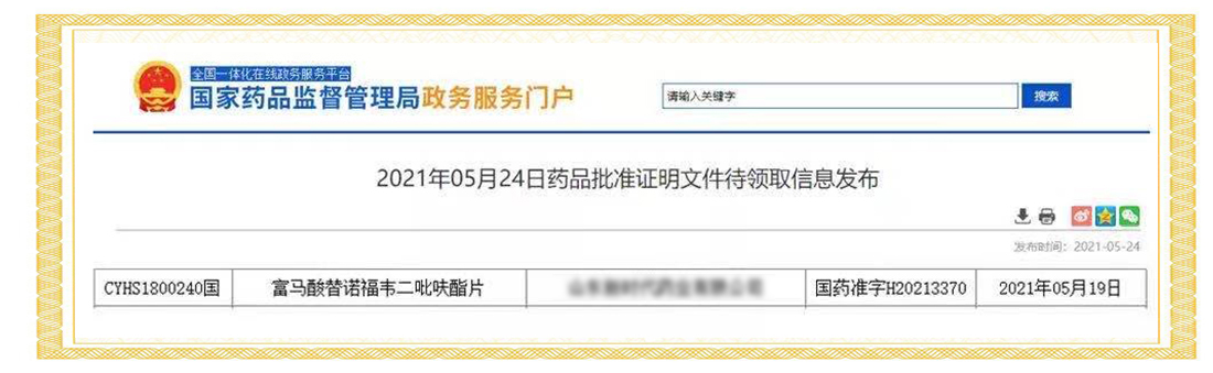 2021年5月19日,國家藥品監(jiān)督管理局正式發(fā)布通知,華威醫(yī)藥接受委托申報(bào)的富馬酸替諾福韋二吡呋酯片項(xiàng)目正式經(jīng)國家藥品監(jiān)督管理局批準(zhǔn)上市,批準(zhǔn)文號:國藥準(zhǔn)字號H20213370。