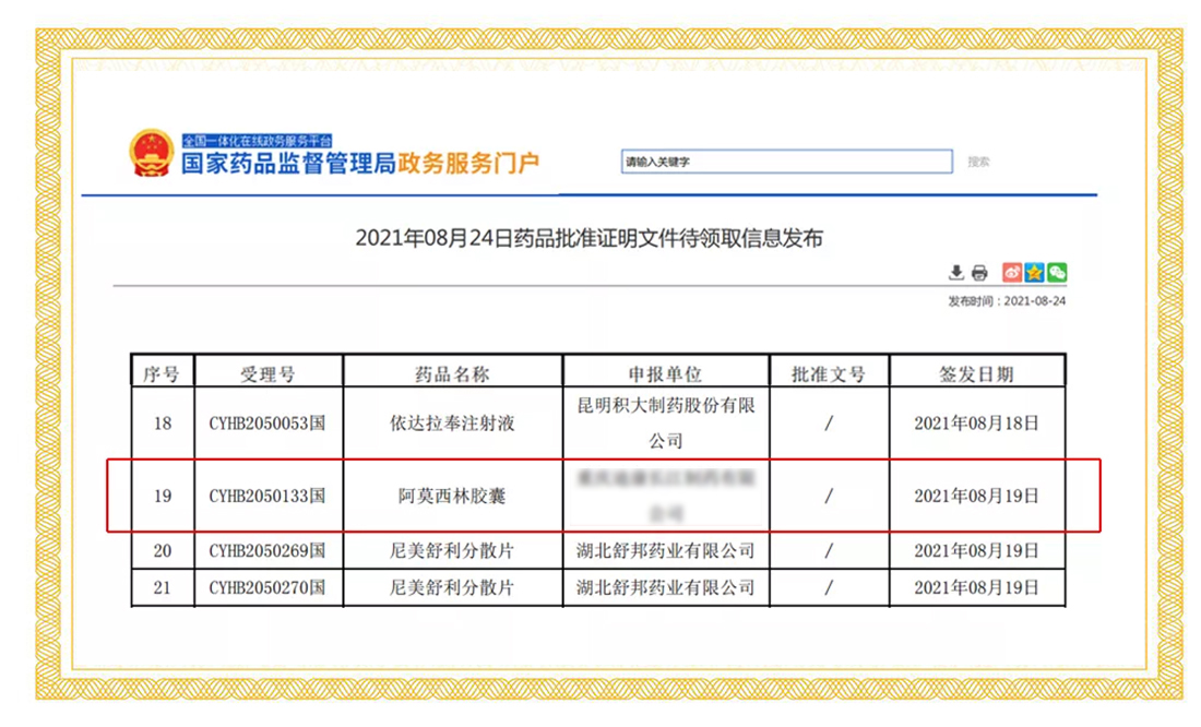 2021年8月19日,國家藥品監(jiān)督管理局正式發(fā)布通知,華威醫(yī)藥接受委托申報(bào)的阿莫西林膠囊正式通過仿制藥質(zhì)量和療效一致性評價(jià)。