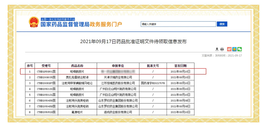 2021年9月10日,國家藥品監(jiān)督管理局正式發(fā)布通知,華威醫(yī)藥接受委托申報(bào)的吡嗪酰胺片項(xiàng)目正式通過仿制藥質(zhì)量和療效一致性評價(jià)。