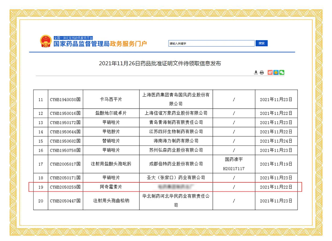 2021年11月22日,國家藥品監(jiān)督管理局正式發(fā)布通知,華威醫(yī)藥接受委托申報(bào)的阿奇霉素片項(xiàng)目正式通過仿制藥質(zhì)量和療效一致性評價(jià)。