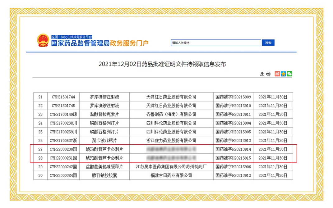 2021年11月30日,國家藥品監(jiān)督管理局正式發(fā)布通知,華威醫(yī)藥接受委托申報(bào)的琥珀酸普蘆卡必利片(1mg、2mg)項(xiàng)目正式通過審評審批,獲得生產(chǎn)批件。